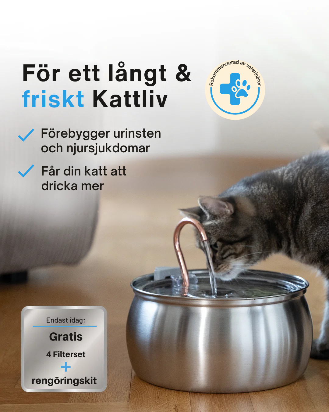 âTillrĂ€ckligt vĂ€tskeintag Ă€r inte bara viktigt för mĂ€nniskor! Hos katter kan vattenbrist leda till allvarliga sjukdomar. Njursvikt och bildandet av urinstenar Ă€r de mest kĂ€nda exemplen, eftersom bĂ„da kan avsevĂ€rt, och ibland plötsligt, förkorta deras livslĂ€ngd.â